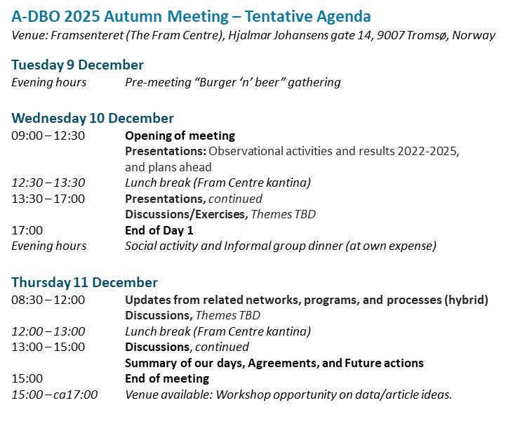 The four DBO:s organized a joint, full-day DBO community meeting at ASSW2025, for presentations of the 2024 sampling activities and the plans for 2025/26, as well as for discussions about common aims and initiatives ahead. For further info see the meeting description and agenda, while we are compiling our meeting summary. A-DBO 2024 Autumn meeting10-12 December 2024 | Bremen, Germany (and online)